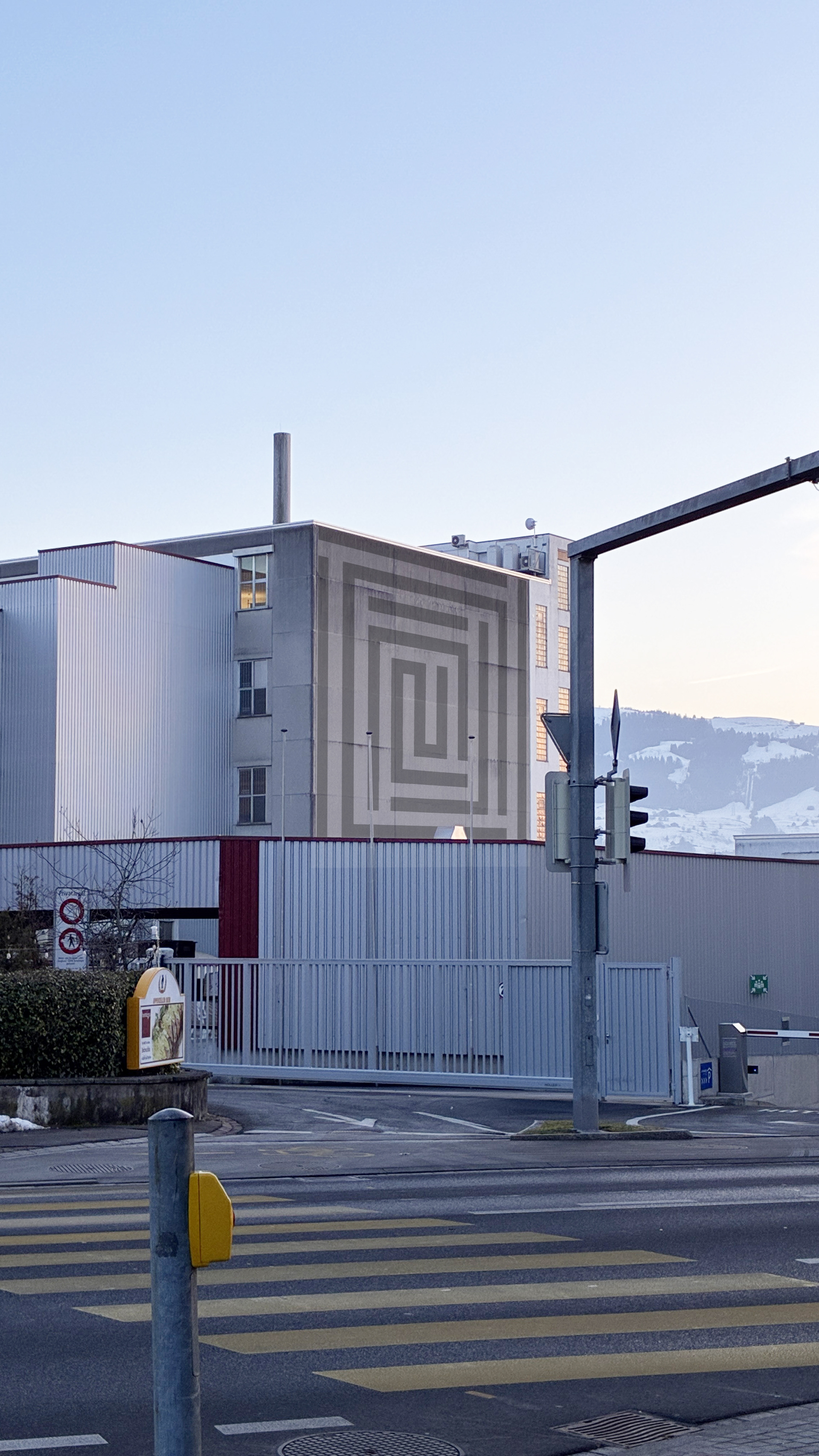 Künstlerische Neukonzeption einer bestehenden Industriefassade. Das Projekt zeigt die Transformation funktionaler Architektur durch grossformatige Grafik und Farbsysteme. Ein Dialog zwischen Industriebau und visueller Identität.